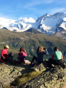 Highlights – Zermatt: The Matterhorn and the Matter valley, surrounded by 30 peaks topping 4,000 m (13,000 ft.); the Monte Rosa massif and Dufourspitze, the highest point in Switzerland; Gornergrat, a cog railway that travels 3,089 m (10,134 ft.) to an impressive overlook, and the Klein Matterhorn, the end point of Switzerlands’s highest cable car at 3,820 m (12,533 ft.) terrific. Having such impressive gondolas and cable cars and cog trains to our trail heads helps us keep above tree line affording incredible views of an area that holds 3/4 of all 4000-meter peaks in the Alps.